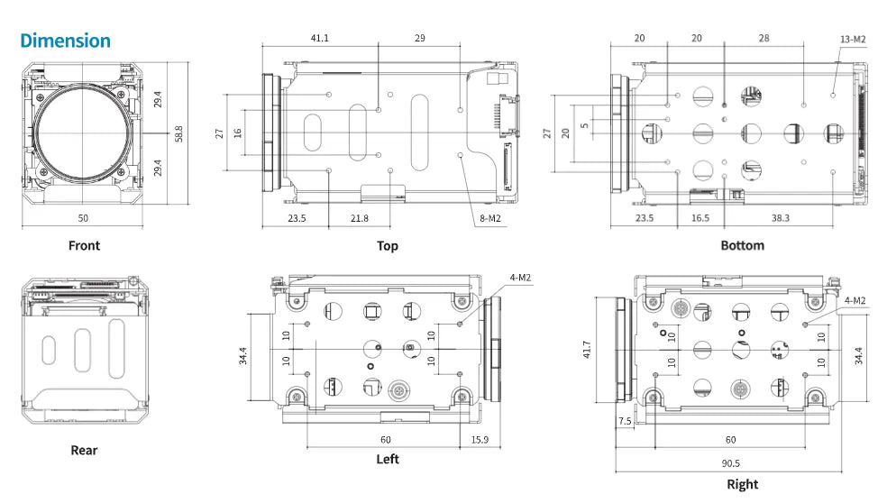With versatile video output options including HD-SDI, EX-SDI, CVBS, TVI, AVI, and LVDS, the camera integrates seamlessly with a wide range of systems. Control is supported through RS-485 protocols (Pelco-D/P, VISCA), while its compact design and DC12V power enable flexible deployment across surveillance, UAV, and security platforms.